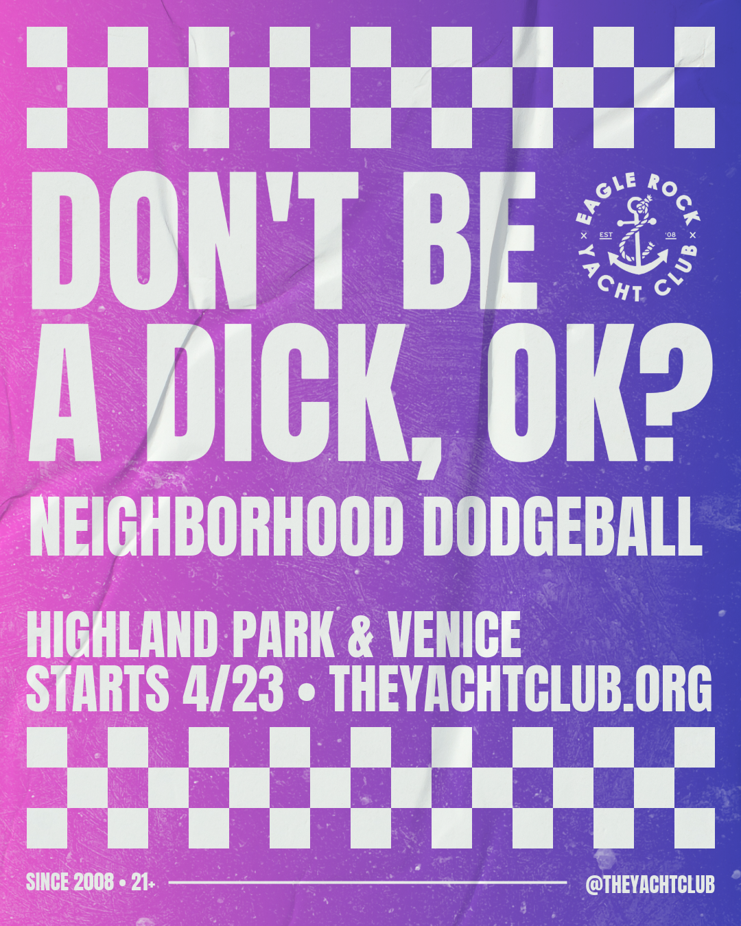 I HEREBY WAIVE AND RELEASE, indemnify, hold harmless and forever discharge the Eagle Rock Yacht Club (ERYC) The City of Los Angeles, Highland Park, Glassell Park, Eagle Rock, North Hollywood, and/or Oakwood Recreational Center and its agents, employees, officers, directors, affiliates, successors and assigns, of and from any and all claims, demands, debts, contracts, expenses, causes of action, lawsuits, damages and liabilities, of every kind and nature, whether known or unknown, in law or equity, that I ever had or may have, arising from or in any way related to my participation in any of the events or activities conducted by, on the premises of, or for the benefit of, ERYC provided that this waiver of liability does not apply to any acts of gross negligence, or intentional, willful or wanton misconduct.